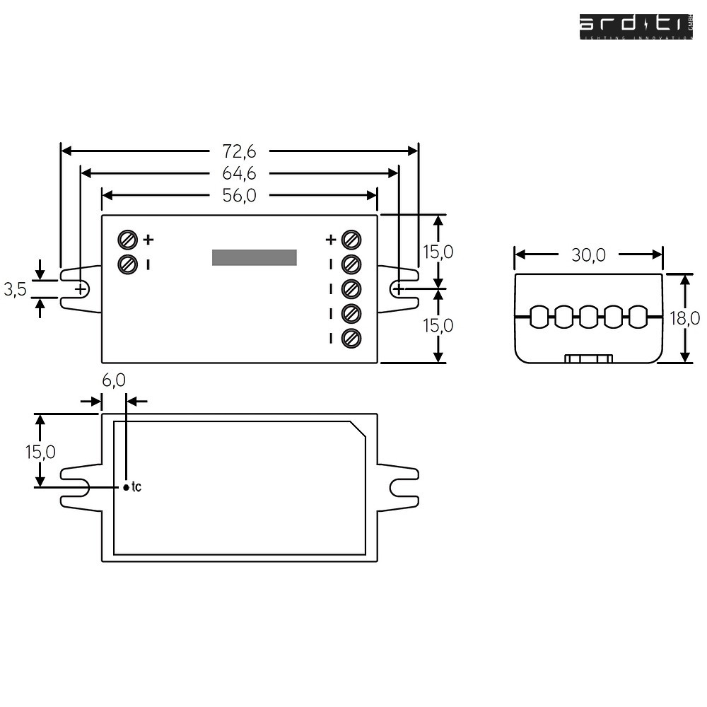 - compact dimensions for installation in boxes and lights just 18mm x 30mmx73mm max.