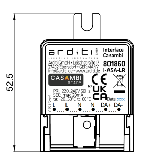 The CASAMBI compatible module is based on a very small, IP20-protected housing with a height of 22 mm and a total length of 56.5 mm and can be installed in wallboxes or luminaires The module is equipped with a configurable interface (max. 7mA control current) for connecting dimmable electronic DALI LED driver.